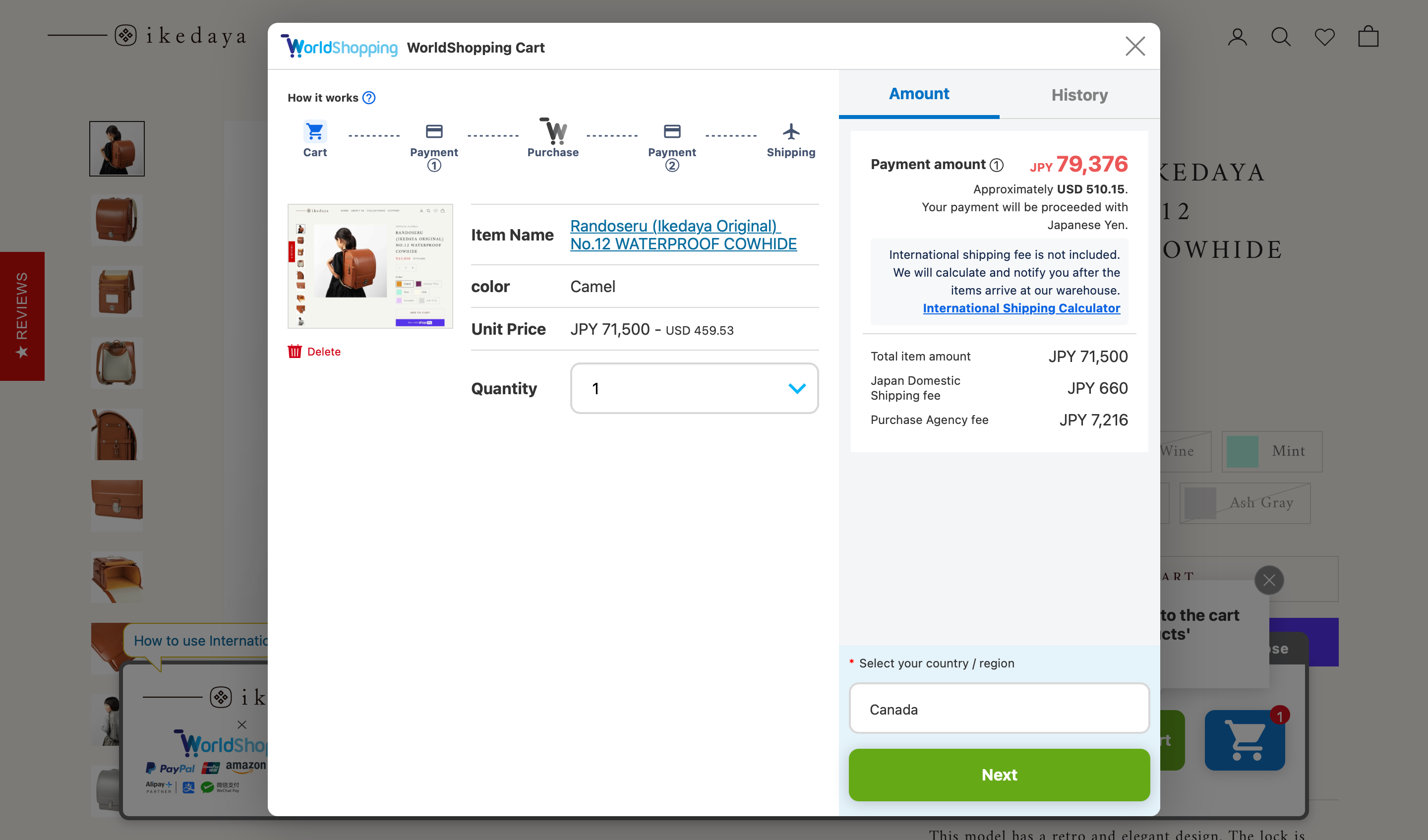 If the shipping address is within Japan, click the “Ignore WorldShopping service” on the banner. It becomes gray, and then you can use the normal shopping cart.