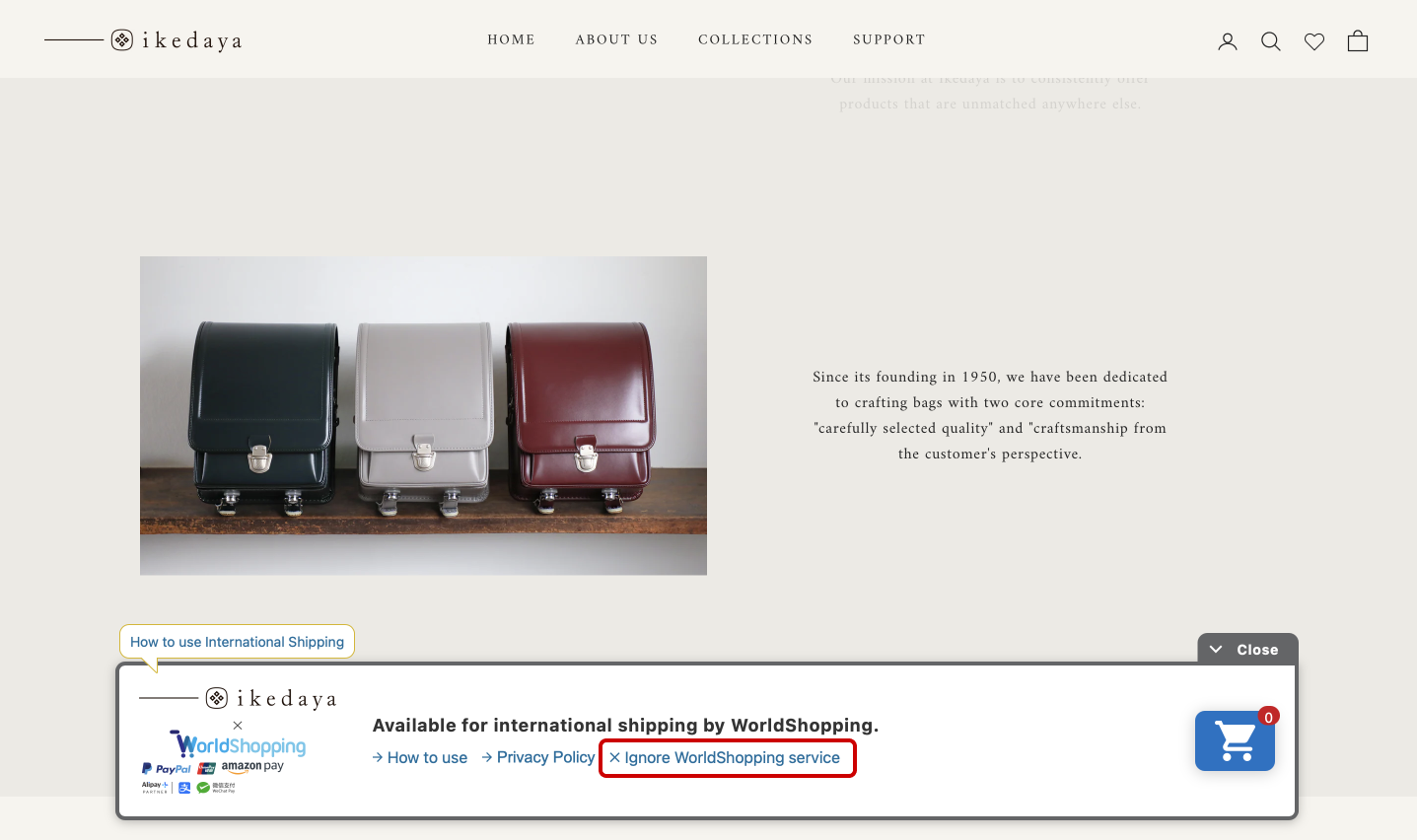 海外に在住で送り先が日本国内の場合、バナーの「Ignore WorldShopping service」 をクリックしていただきますと、バナーがグレーになり、通常のショッピングカートをご利用いただけます。